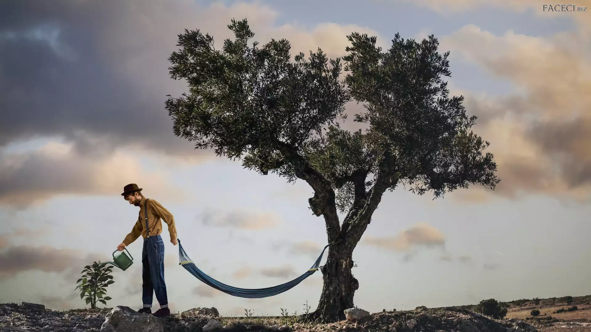 Hamak, Mężczyzna, Fotomontaż, Konewka, Drzewa, Śmieszne - faceci.biz