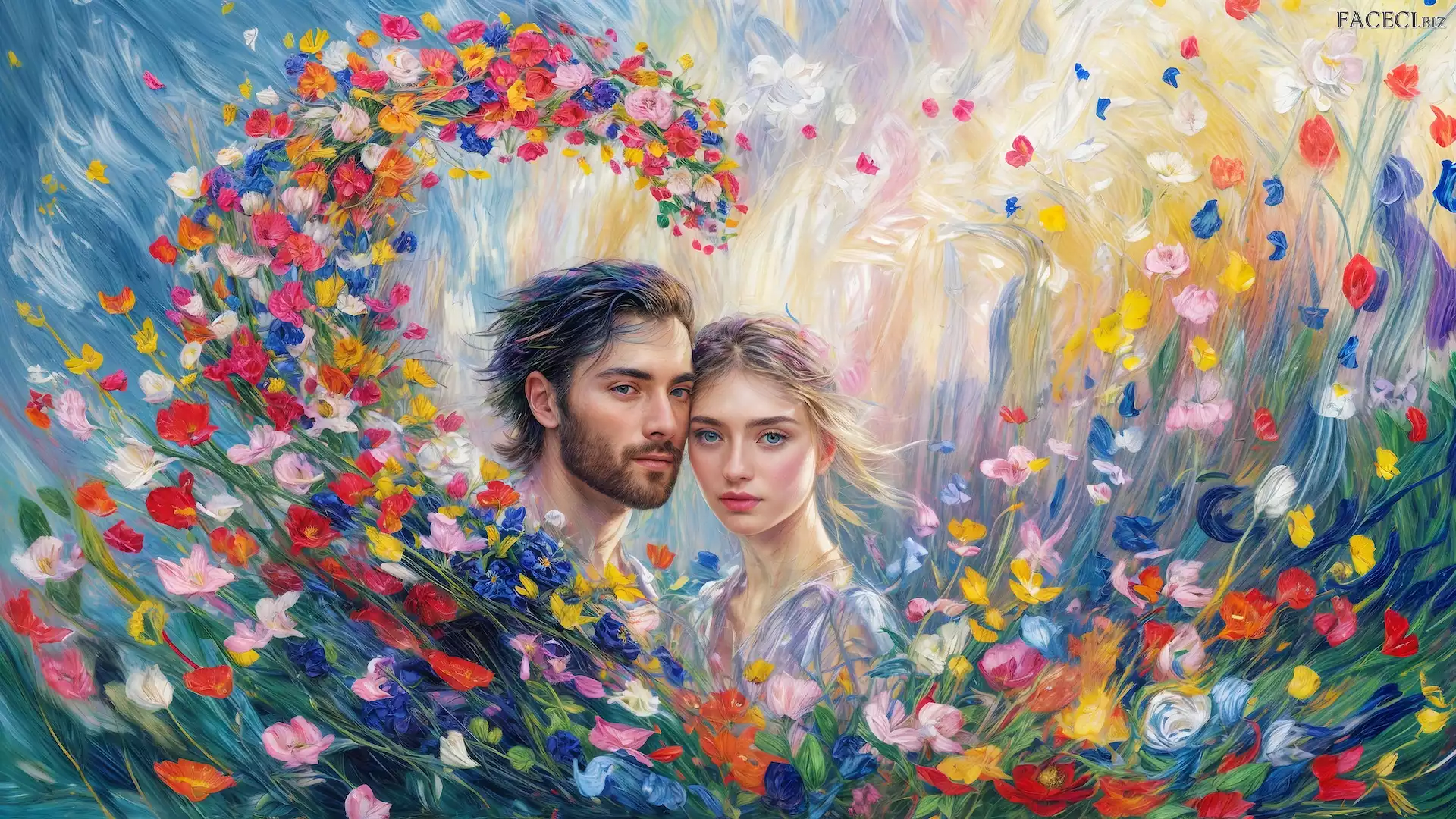 Zakochani, Grafika, Kobieta, Mężczyzna, Kwiaty, Serce - faceci.biz